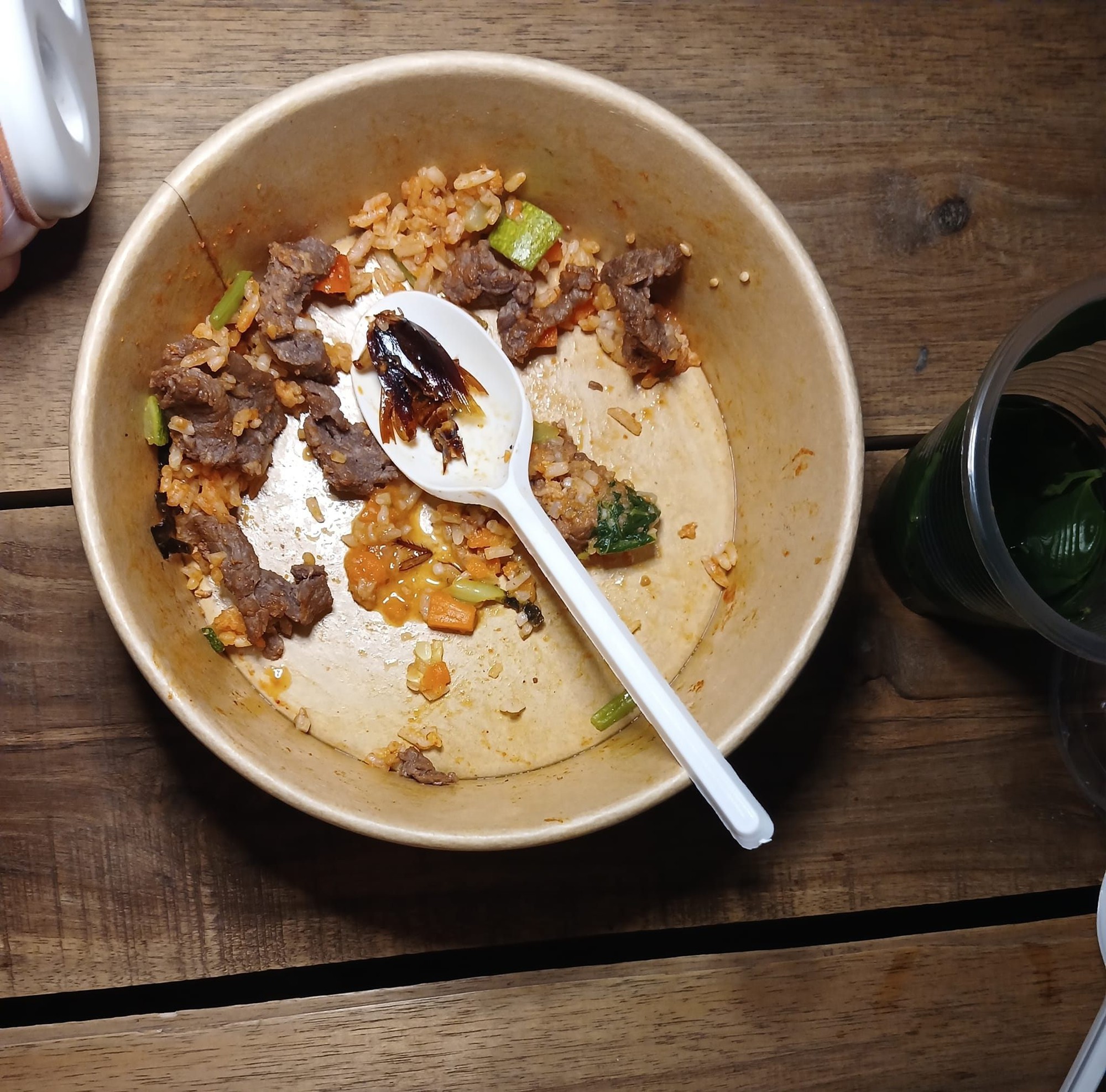 Cụ thể T có đặt một suất cơm trộn bò kèm kimbap chiên và một chai nước ship về nhà để dùng bữa. Đang ăn đến gần hết bát cơm, T phát hiện ra một con gián trong bát cơm. Sốc hơn cả, có vẻ như T đã ăn phải một phần của con gián bởi khi phát hiện ra "chú tiểu cường" này đã bị lẹm mất 1 góc.