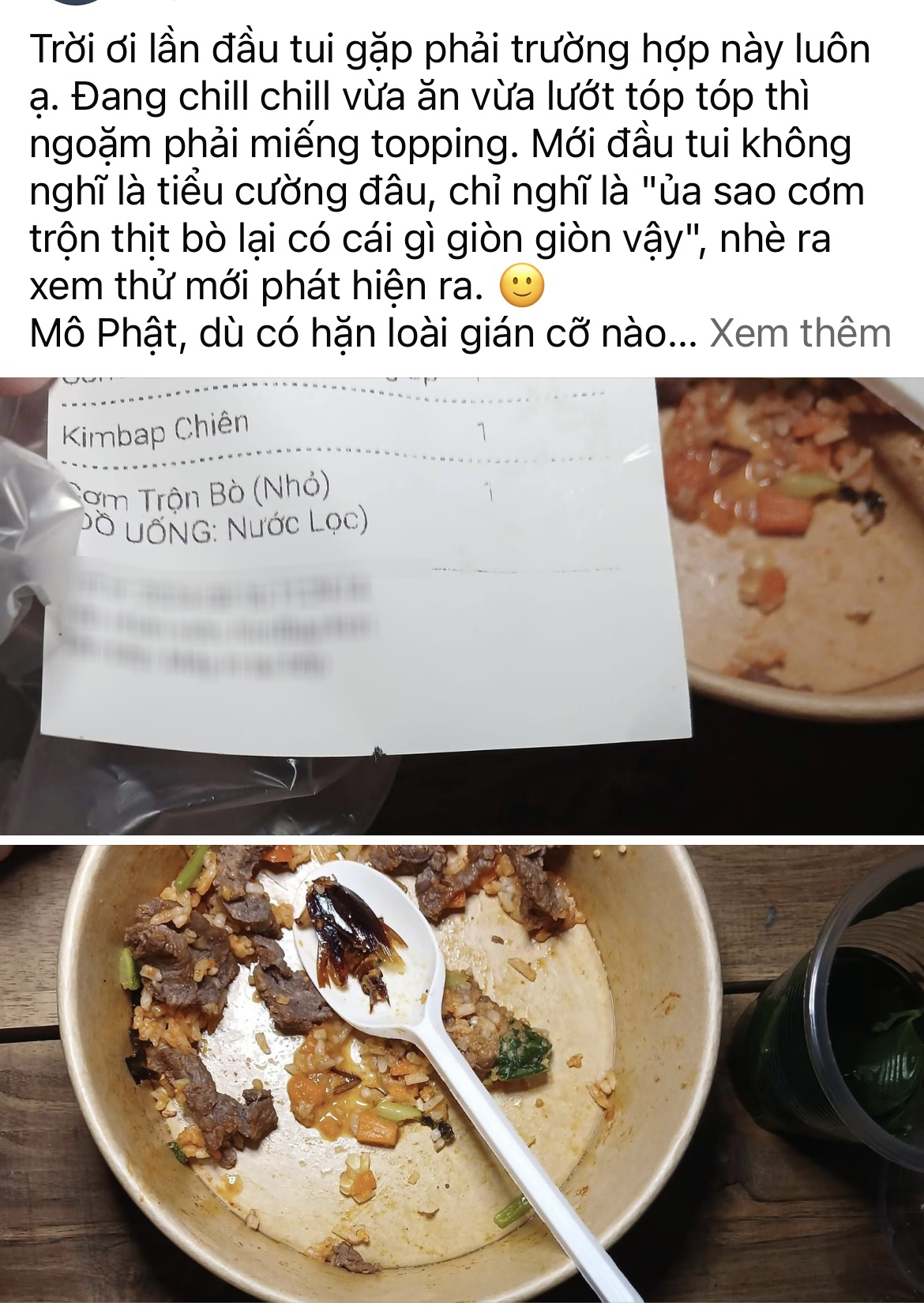 "Trời ơi lần đầu tôi gặp phải trường hợp này luôn. Đang chill chill vừa ăn vừa lướt Tóp Tóp thì ngoặm phải miếng topping. Mới đầu tôi không nghĩ là tiểu cường đâu, chỉ nghĩ là 'ủa sao cơm trộn thịt bò lại có cái gì giòn giòn vậy', nhè xem thử mới phát hiện ra.