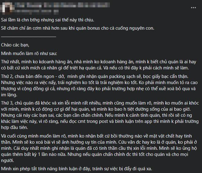 Sau khi bài viết được đăng tải, chủ quán ăn đã chủ động liên lạc với khách để giải quyết sự cố. Tuy nhiên, thực khách này khẳng định sẽ không quay lại quán thêm lần nào nữa.