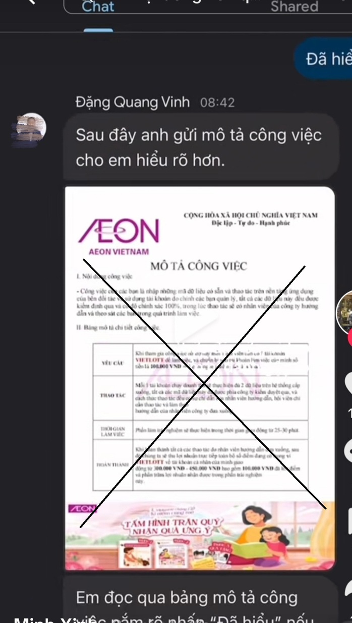 Mới đây, một tài khoản trên mạng xã hội Tiktok có tên M.X. đăng chuyện vừa rơi vào bẫy lừa đảo tuyển dụng của Facebook giả mạo AEON VIETNAM và mất 15 triệu đồng.