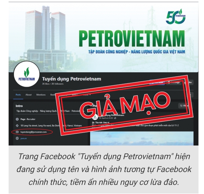 Mới đây, Tập đoàn Công nghiệp - Năng lượng Quốc gia Việt Nam (Petrovietnam) đã cảnh báo về việc xuất hiện trang Facebook mạo danh để đăng thông tin tuyển dụng với mức lương hấp dẫn. Trang thông tin này có tên là Tuyển dụng Petrovietnam, có logo, banner tương tự của Petrovietnam và thường xuyên đăng tải thông tin về hoạt động của Petrovietnam nhưng đưa địa chỉ email tuyển dụng không chính xác.