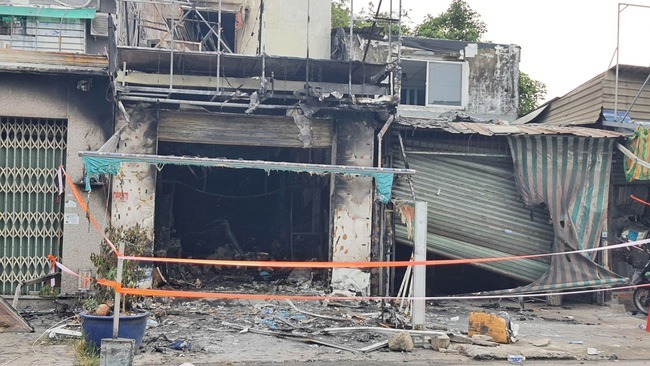 Tại hiện trường, xe máy và nhiều đồ đạc bị biến dạng, biển hiệu bị cháy trơ khung. Toàn bộ ngôi nhà ám khói đen.