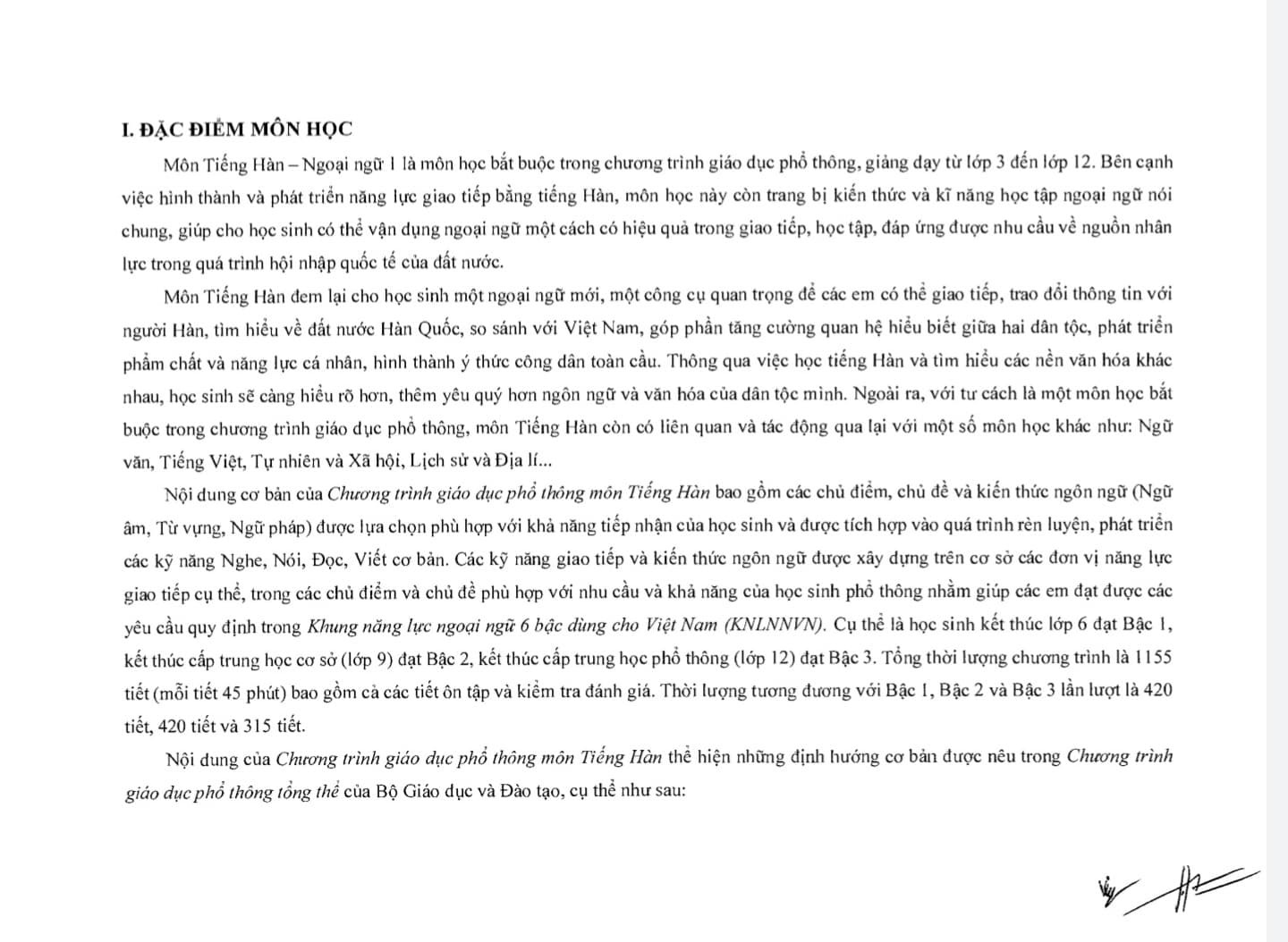 Trong quyết định này, môn Tiếng Hàn được Bộ GD-ĐT xác định là ngoại ngữ 1, là môn học 'bắt buộc' trong chương trình giáo dục phổ thông, giảng dạy từ lớp 3 đến lớp 12.