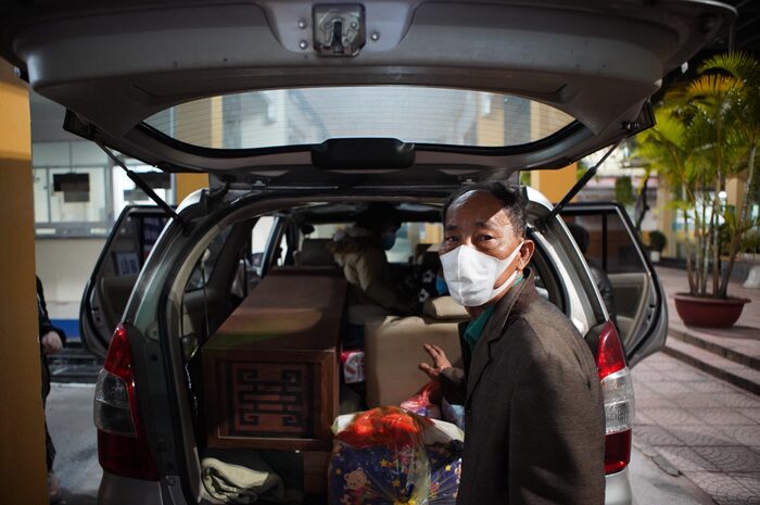 2h sáng 13/3, xe tang lễ có mặt tại cổng Bệnh viện Xanh Pôn trên đường Nguyễn Thái Học để đưa thi thể bé Đ.N.A. (3 tuổi, trú huyện Thạch Thất, Hà Nội) đi hoả thiêu tại Ba Vì, Hà Nội.