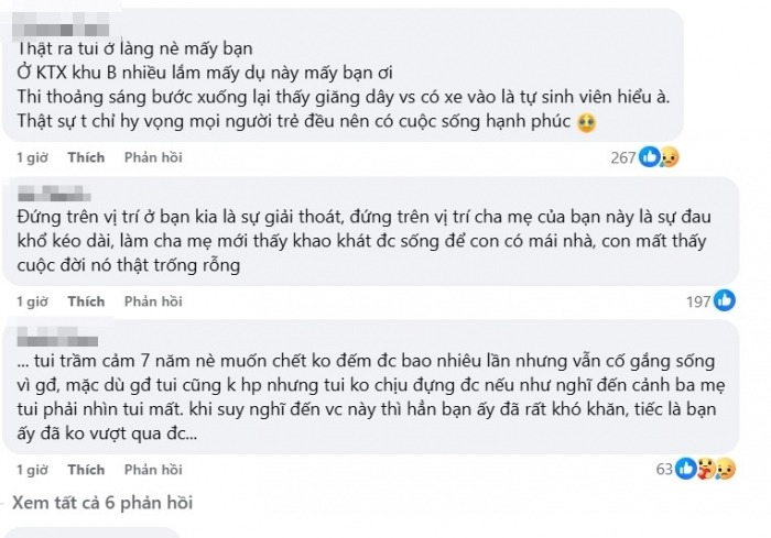 "Thật ra tui ở làng nè mấy bạn. Ở KTX khu B nhiều lắm mấy vụ này mấy bạn ơi. Thi thoảng sáng bước xuống lại thấy giăng dây với có xe vào là tự sinh viên hiểu à. Thật sự tui chỉ hy vọng mọi người trẻ đều nên có cuộc sống hạnh phúc".