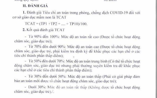 Cụ thể, nếu kết quả đạt từ 90% đến 100% tiêu chí an toàn thì mức độ an toàn rất cao, được tổ chức hoạt động dạy học.