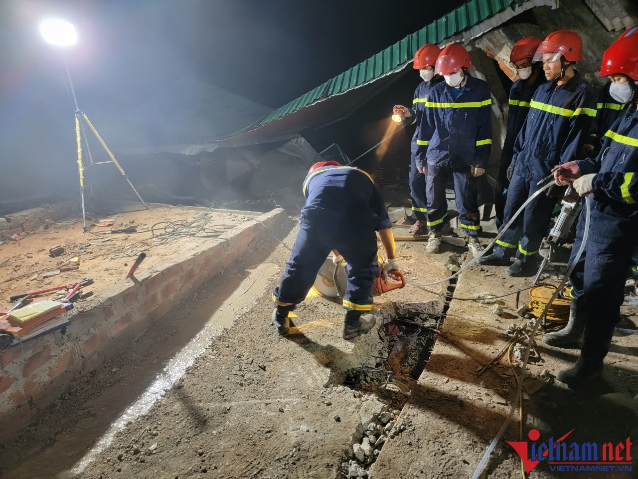 Tại hiện trường, lực lượng chức năng sử dụng máy móc chuyên dụng, máy khoan cắt bê tông, xuyên đêm tìm kiếm người dân gặp nạn.