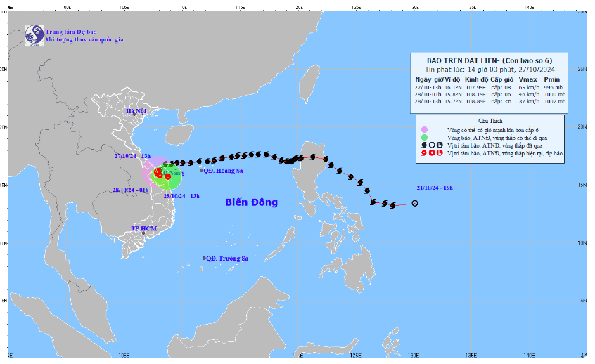 Hồi 13 giờ ngày 27/10, vị trí tâm bão ở vào khoảng 16,1 độ Vĩ Bắc; 107,9 độ Kinh Đông, trên đất liền các tỉnh Thừa Thiên Huế, Quảng Nam-Đà Nẵng. Sức gió mạnh nhất vùng gần tâm bão mạnh cấp 8 (62-74km/h), giật cấp 10. Di chuyển theo hướng Tây Nam, tốc độ khoảng 10km/h.