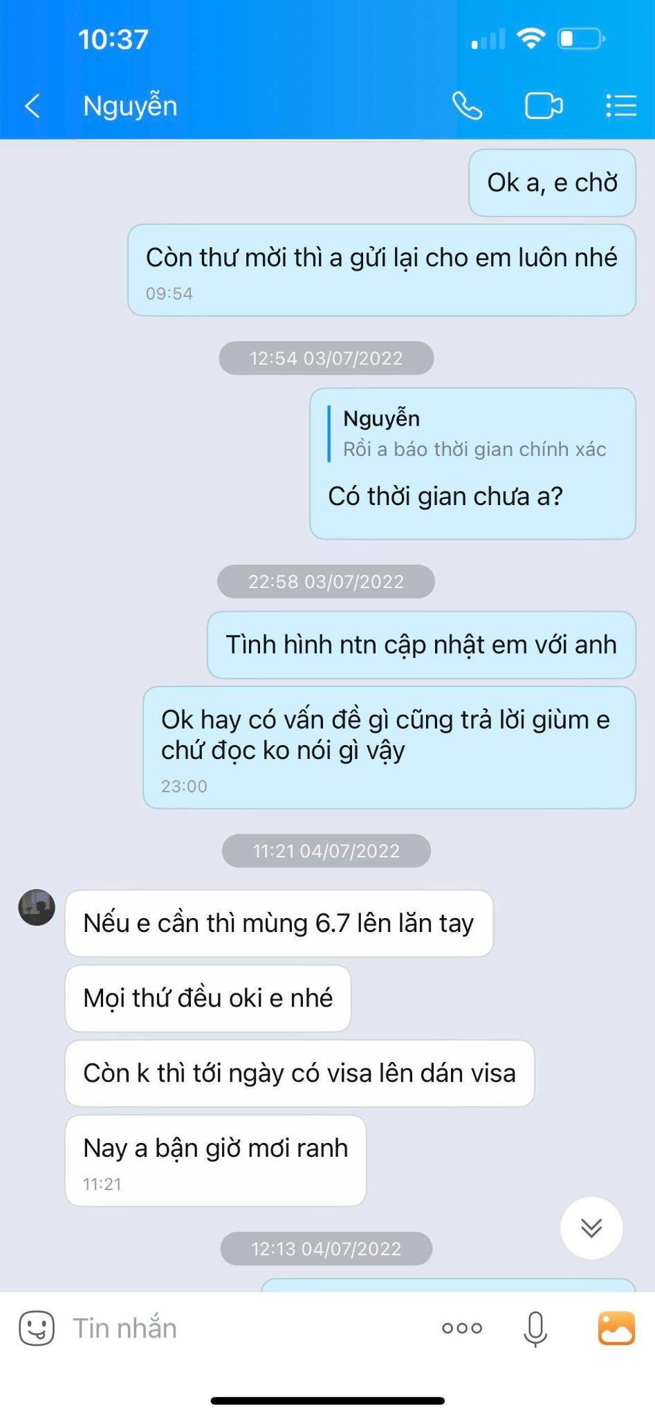 Mỗi khi anh Nhật có thắc mắc, tài khoản Bích Nguyệt và tài khoản Zalo nhận là chồng Bích Nguyệt đều nhiệt tình giải đáp và cung cấp thông tin. Khi anh Nhật hỏi về việc tại sao khi tra mã số thuế lại ra một công ty trong lĩnh vực không liên quan, 2 tài khoản trả lời đó là công ty do anh trai của chồng đứng tên. Họ cũng khéo léo gửi những hình ảnh về các cuộc giao dịch thành công với nhiều khách. Cùng với chiêu bài luôn cam đoan, đảm bảo sẽ giúp khách nhận được visa, họ dần lấy được lòng tin của anh Nhật.