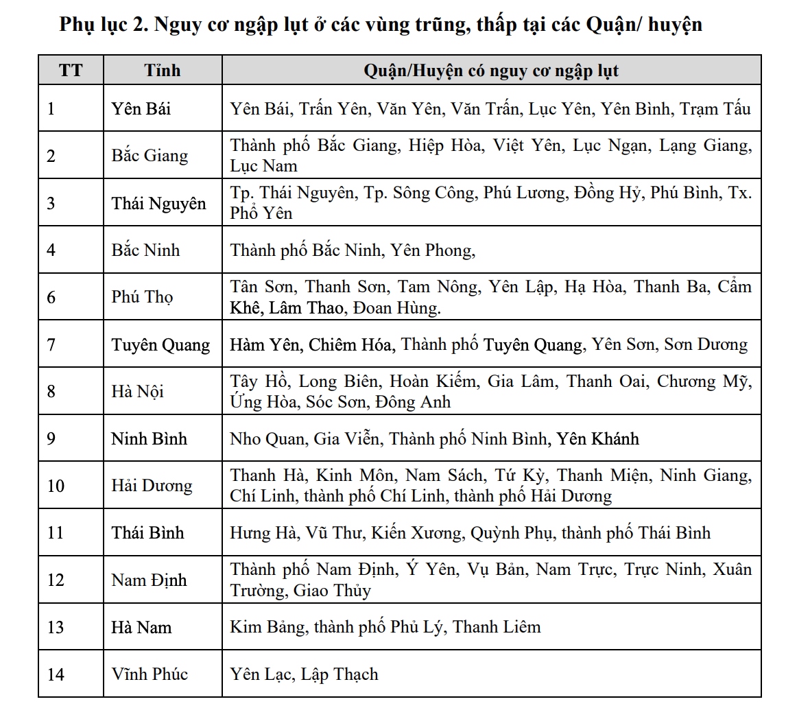 Tình trạng ngập lụt tại các vùng trũng thấp ven sông tại các tỉnh Lạng Sơn, Cao Bằng, Lào Cai, Yên Bái, Phú Thọ, Bắc Giang, Bắc Kạn, Thái Nguyên, Hòa Bình; lũ quét và sạt lở đất trên các sườn dốc ở khu vực vùng núi Bắc Bộ (thông tin dự báo, cảnh báo lũ quét, sạt lở đất thời gian thực được cung cấp trực tuyến trên trang thông tin điện tử của Tổng cục Khí tượng Thủy văn tại địa chỉ: http://luquetsatlo.nchmf.gov.vn/ và trong bản tin riêng cảnh báo lũ quét, sạt lở đất).