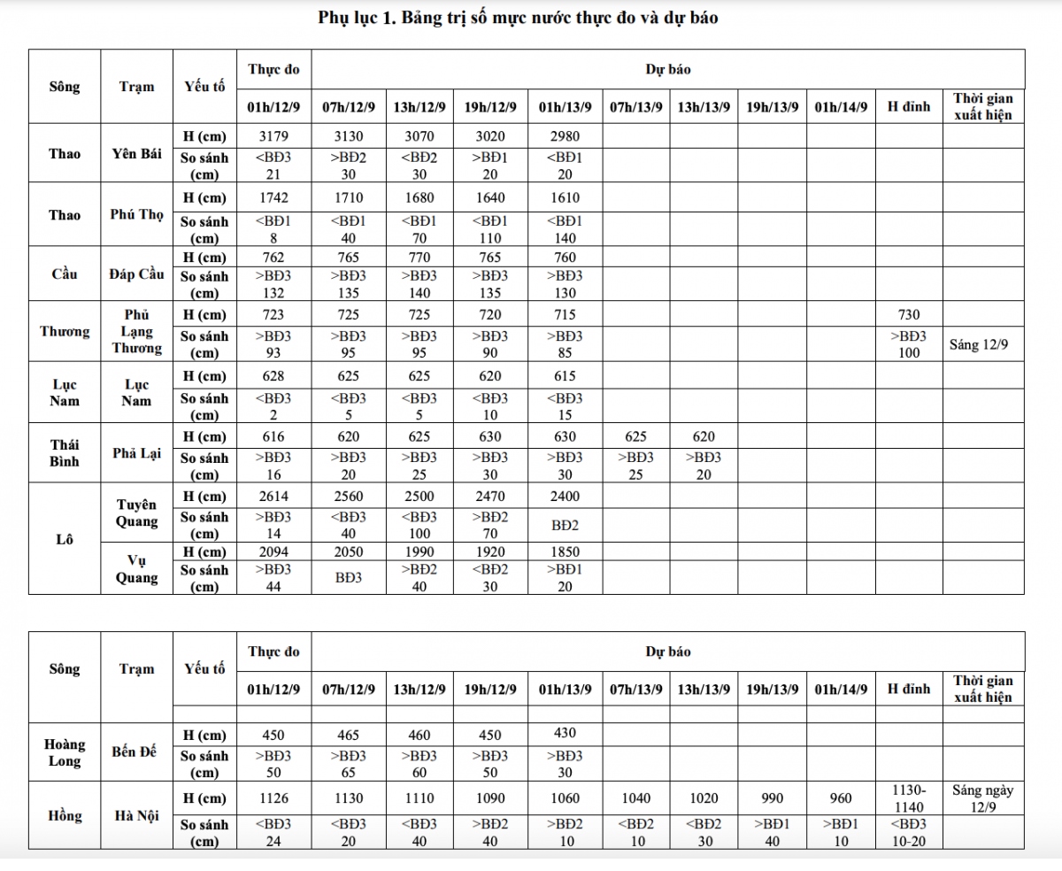 Mực nước lúc 1h ngày 12/9, trên các sông như sau: