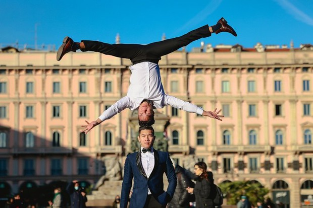 Quốc Nghiệp cũng đưa ra một số clip được ghi trực tiếp tại hiện trường. Theo các clip này, quá trình chồng đầu lên nhau, các nghệ sĩ được buộc dây an toàn và lúc di chuyển có sự hỗ trợ của các thành viên trong đoàn làm phim; khu vực thực hiện cảnh quay này được rào chắn, cấm người lạ vào bên trong.