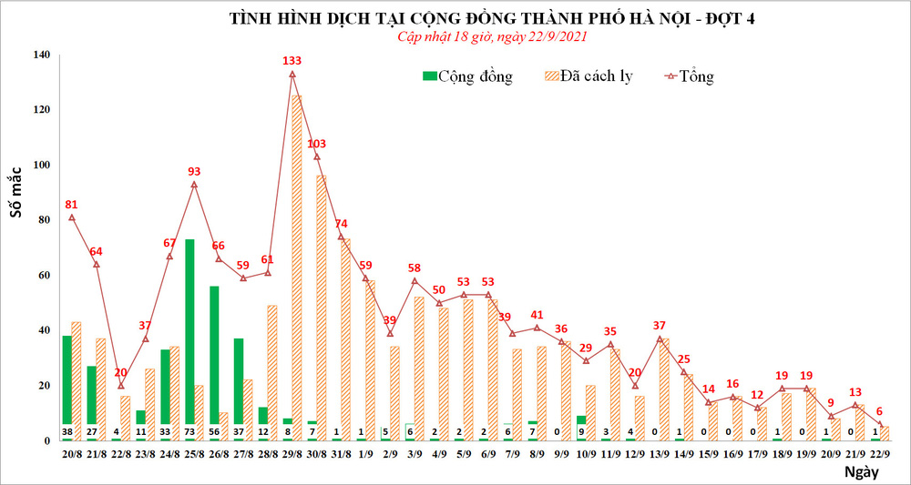 Như vậy, tính từ 18h ngày 21/9 đến 12h ngày 22/9, Hà Nội ghi nhận 6 ca dương tính, trong đó có 5 ca tại khu cách ly, 1 ca cộng đồng. Đây cũng là ngày ghi nhận số ca mắc Covid-19 thấp nhất tính từ ngày 24/7.