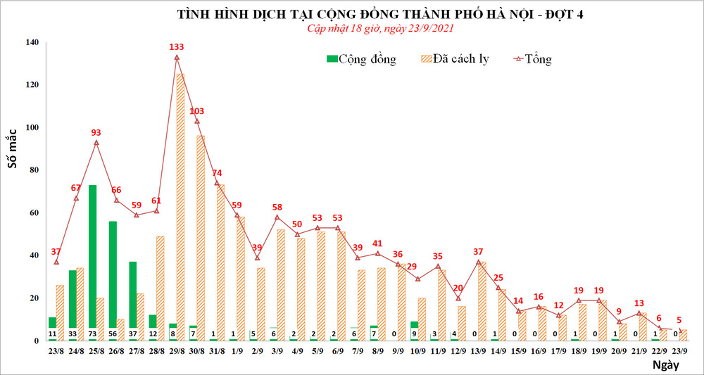 Theo đó, tính chung cả ngày 23/9, thành phố ghi nhận 5 ca dương tính SARS-CoV-2, trong đó, 2 ca tại khu cách ly, 3 ca tại khu vực phong tỏa.