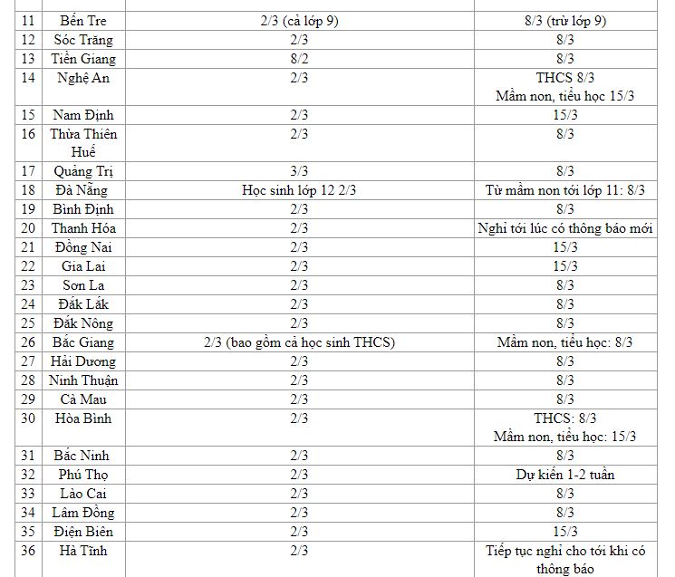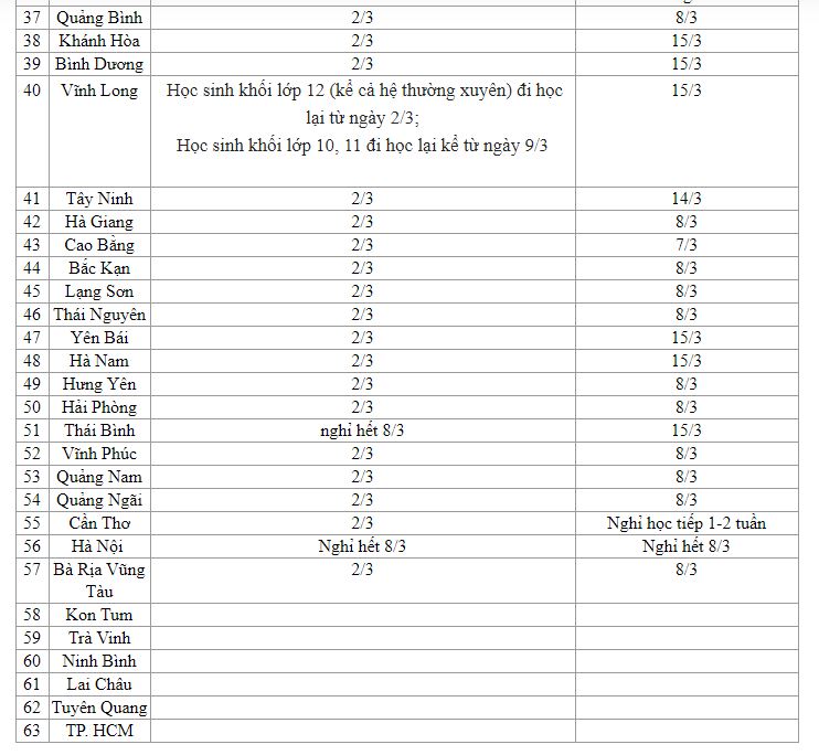 Căn cứ vào tình hình thực tế tại địa phương, tính tới sáng ngày 29/2 đã có gần 60 tỉnh, thành phố thông báo lịch quay lại trường của học sinh. Trong đó, học sinh bậc THPT ở hầu hết các tỉnh đều đi học lại vào ngày 3/2, còn các cấp từ mầm non tới THCS nghỉ thêm 1-2 tuần.