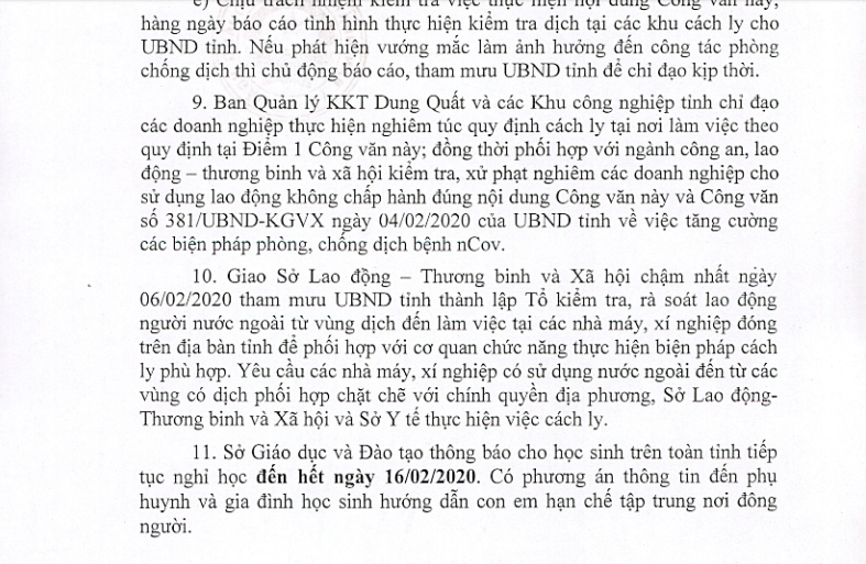 Trong công văn, UBND tỉnh Quảng Ngãi đã yêu cầu Sở GD-ĐT thông báo cho học sinh trên toàn tỉnh tiếp tục nghỉ học đến hết ngày 16/2/2020. Sở có phương án thông tin đến phụ huynh và học sinh hướng dẫn con em hạn chế tập trung nơi đông người.