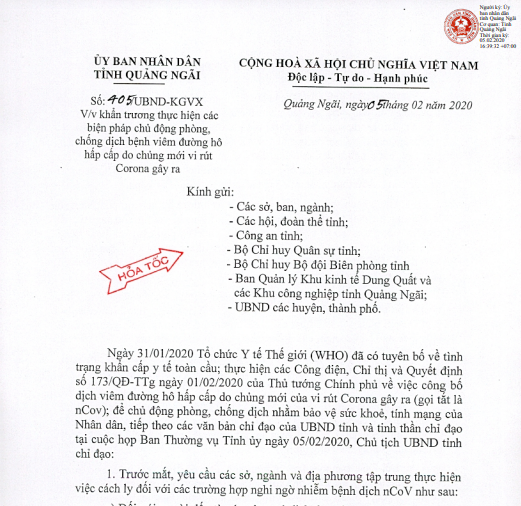 Mới đây, UBND tỉnh Quảng Ngãi đã có công văn hoả tốc gửi đến các sở, ban ngành; các hội, đoàn thể tỉnh; công an tỉnh; bộ chỉ huy Quân sự tỉnh; bộ chỉ huy Bộ đội Biên phòng tỉnh; ban Quản lý Khu kinh tế Dung Quất và các Khu công nghiệp tỉnh Quảng Ngãi; UBND các huyện, thành phố về việc khẩn trương thực hiện các biện pháp chủ động phòng, chống dịch bệnh viêm đường hô hấp cấp do chủng mới vi rút Corona gây ra.