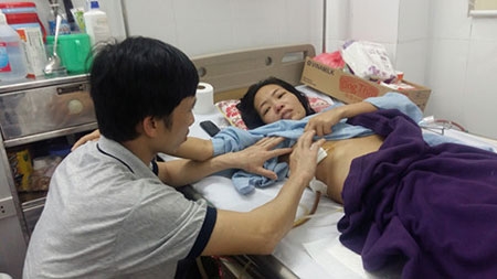 Hơn một tháng nay, Chín chưa ngày nào rời bệnh viện. Anh vẫn tận tụy chăm sóc vợ như người mẹ chăm con thơ và cứ lặng lẽ lau nước mắt khi thấy vợ lên cơn đau.