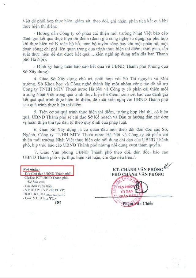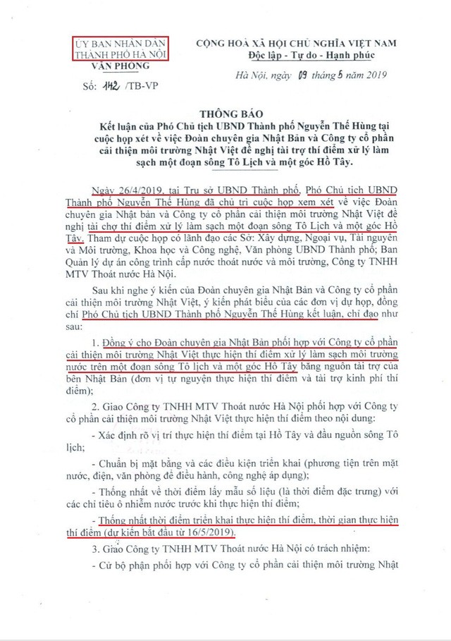 Theo JEBO, sau khi nghe ý kiến của Đoàn chuyên gia Nhật Bản, JEBO và Công ty Cổ phần Cải thiện Môi trường Nhật Việt, ý kiến phát biểu của các đơn vị dự họp, Ngài Phó Chủ tịch UBND Thành phố Nguyễn Thế Hùng kết luận: "Đồng ý cho Đoàn chuyên gia Nhật Bản phối hợp với Công ty Cổ phần Cải thiện Môi trường Nhật Việt (JVE) thực hiện thí điểm xử lý làm sạch môi trường nước trên một đoạn sông Tô Lịch và một góc Hồ Tây bằng nguồn tài trợ của bên Nhật Bản (đơn vị tự nguyện thực hiện thí điểm và tài trợ kinh phí thí điểm)".