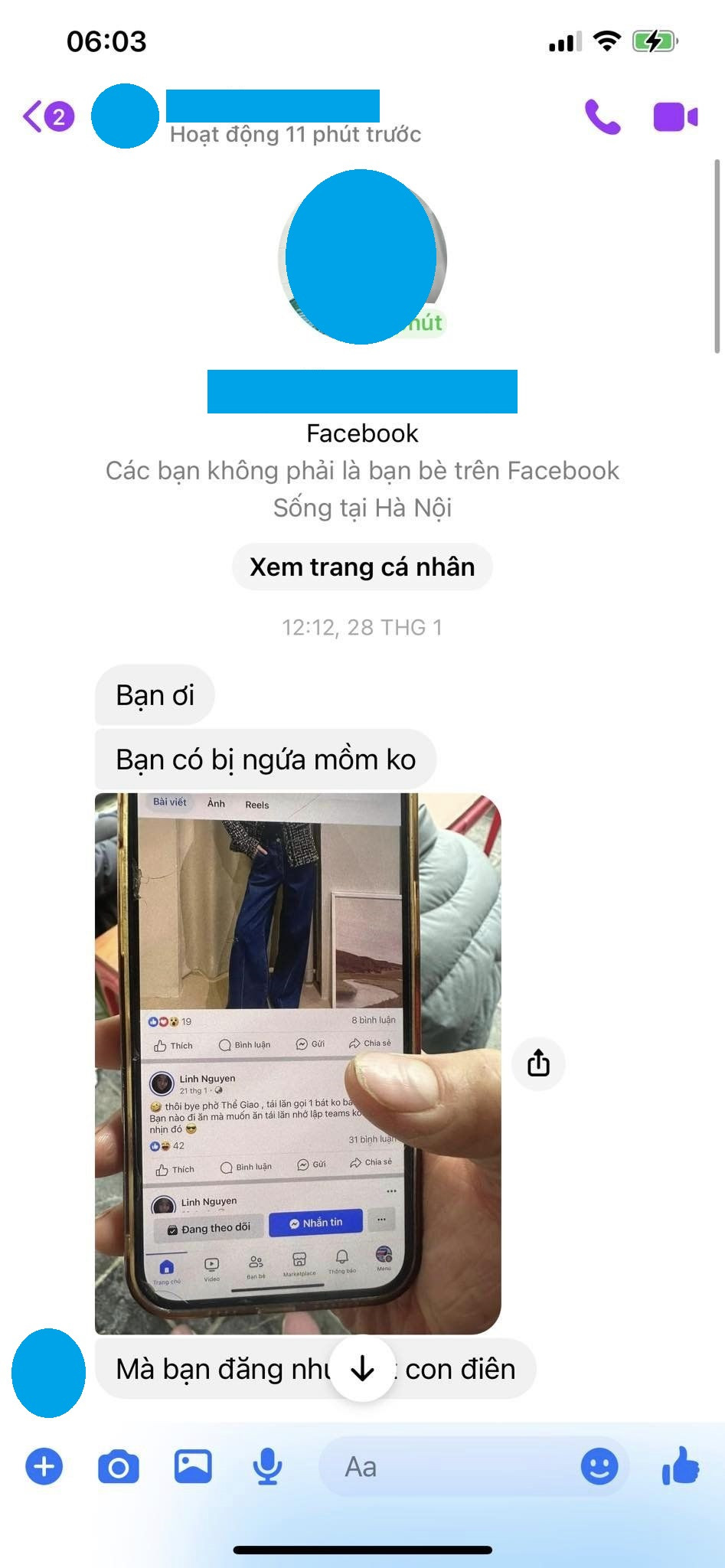 Người này nhắn tin tới chị L. với nhiều từ nghĩ chỉ trích: "Bạn có bị ngứa mồm không", "Bạn đăng như con điên", "Bạn đăng câu like đi"... Tài khoản N.H cho rằng quán không làm được món phở xào lăn nên nhờ chị L. đổi món chứ không ép buộc.