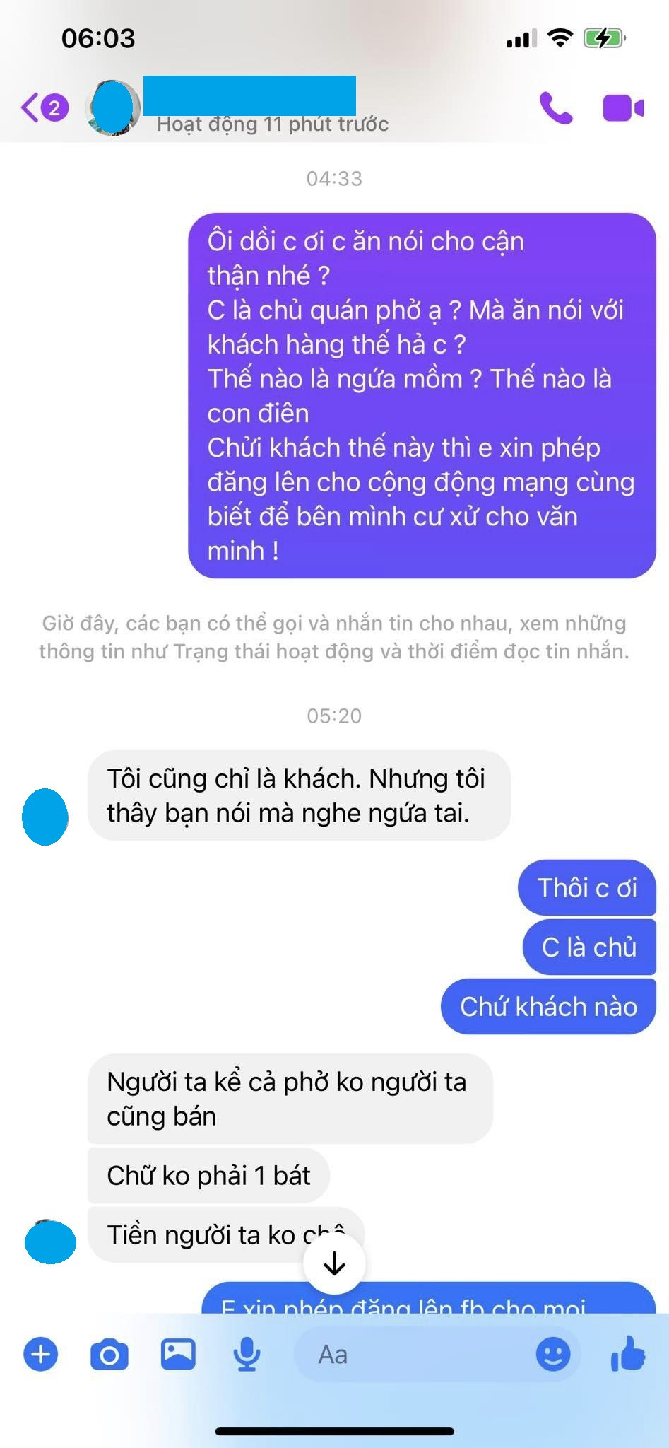 Chị L. bức xúc khi ban đầu tài khoản N.H tự nhận là "khách hàng của quán", nhưng sau đó nói rằng “nhà tôi không bao giờ trả lời không bán một bán phở tái lăn". Điều này khiến chị L. cho rằng, tài khoản N.H là chủ quán. Chị L. đăng tải toàn bộ cuộc trò chuyện của cả hai lên nhiều hội nhóm mạng xã hội khiến câu chuyện về cách cư xử giữa nhân viên quán - khách hàng trở thành chủ đề được cộng đồng mạng bàn tán sôi nổi.