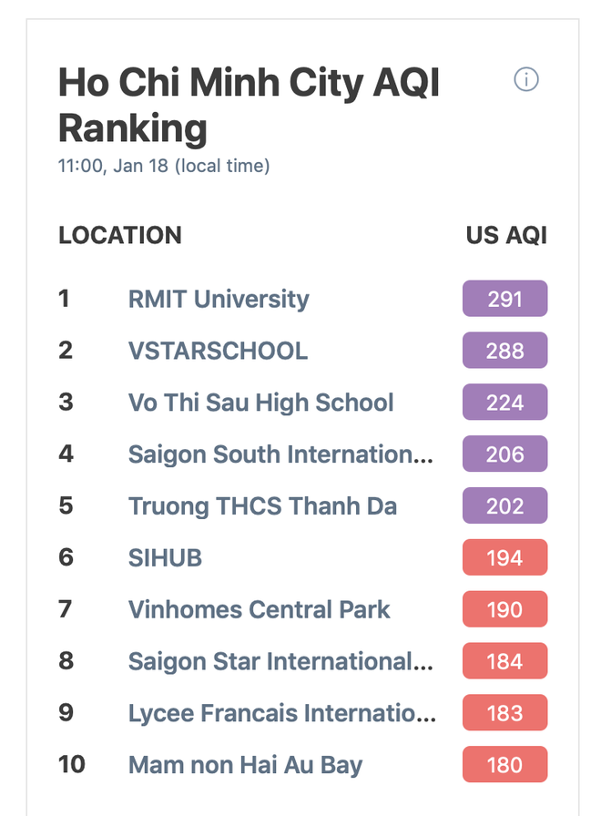 Theo ghi nhận của chúng tôi, vào trưa cùng ngày trong khi chỉ số ô nhiễm (AQI) tại trang web Air Visual trung bình là 188, trong đó cao nhất là 288 (mức tím) tại khu vực quận 7, còn khu vực quận Bình Thạnh là trên 200 (mức tím), quận 1 cao nhất là 194 (mức đỏ).