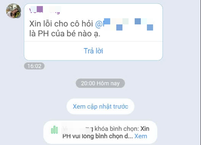 Song song với dóng tin nhắn, cô còn tạo bình chọn trên Zalo với nội dung là "đồng ý/không đồng ý" để phụ huynh đưa quan điểm. Khi có phụ huynh nêu ý kiến không đồng ý, cô H. lập tức hỏi "danh tính" rồi khóa bình chọn. Kết quả bình chọn có 26 phụ huynh đồng ý, 3 phụ huynh không đồng ý, 9 phụ huynh không ý kiến.