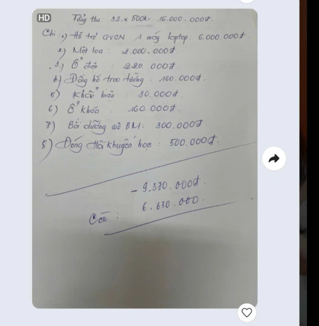 Đến ngày 24/9, cô H. gửi bản chụp chi phí các khoản đã chi sau khi nhận tiền từ các phụ huynh cho thành viên ban đại diện. Dù quyết không nhận laptop, nhưng trong bản thu chi này vẫn mặc định ghi tiền laptop 6 triệu, loa 2 triệu.
