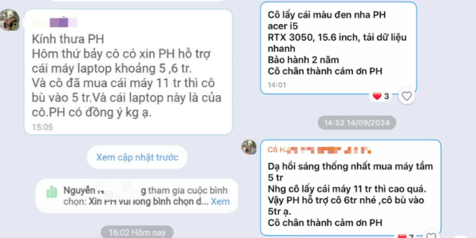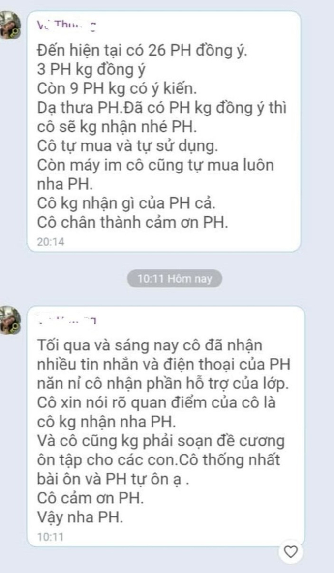 2 ngày sau, tức ngày 16/9, cô H. tiếp tục nhắn 1 tin vào group lớp với nội dung: " Hôm thứ 7 (14/9), cô có xin phụ huynh hỗ trợ laptop khoảng 5 - 6 triệu đồng. Cô đã mua máy 11 triệu đồng thì cô bù vào 5 triệu đồng và laptop này là của cô. Phụ huynh có đồng ý không ạ? ".