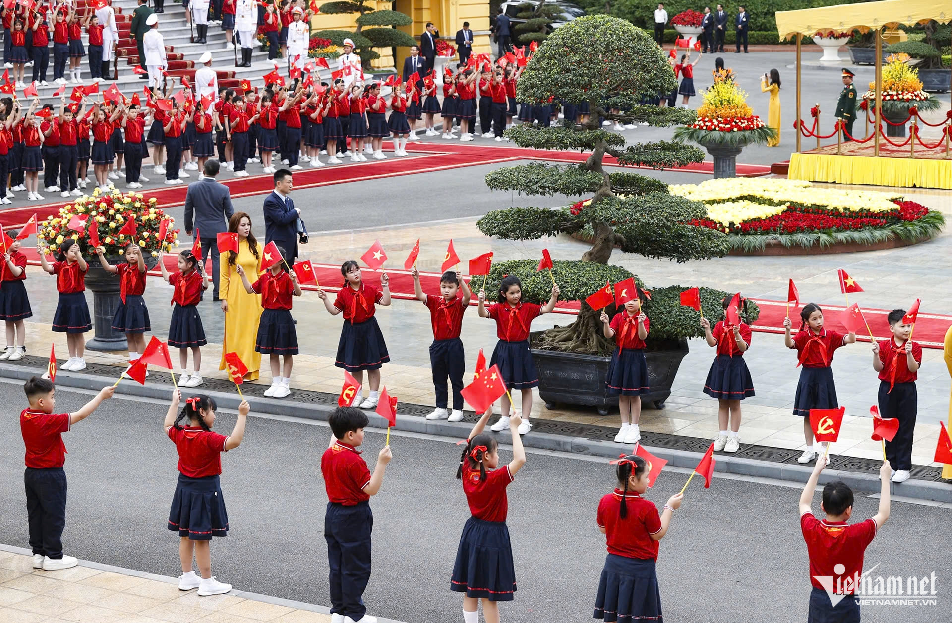 Chiều nay, Hà Nội nắng vàng rực rỡ, quốc kỳ của Việt Nam và Trung Quốc tung bay trong gió, nổi bật trên nền trời. Các chiến sĩ Đội danh dự Quân đội nhân dân Việt Nam đứng trang nghiêm trong đội hình đón hai nhà lãnh đạo.