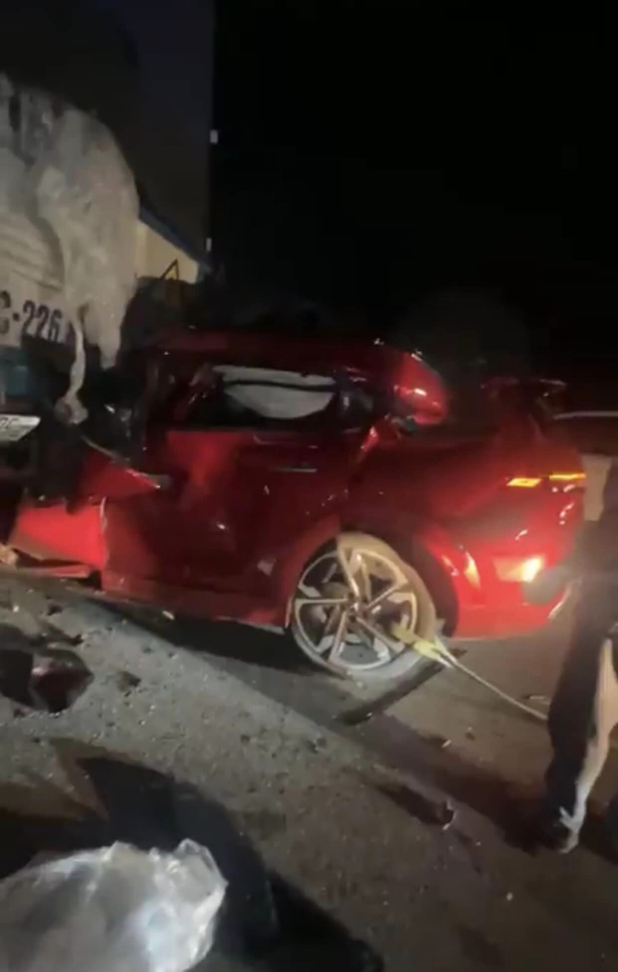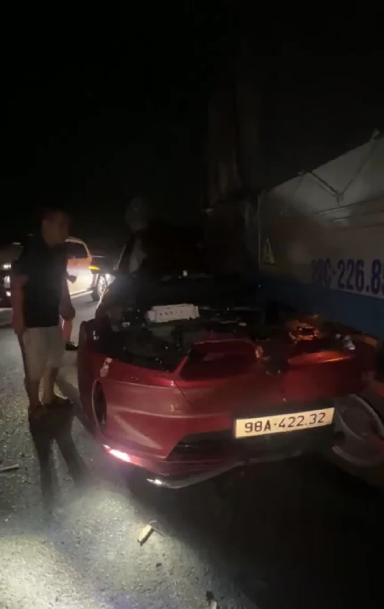 Người chia sẻ vụ việc trực tiếp từ hiện trường cho biết, chiếc xe tải gặp sự cố dừng lại bên đường, sau đó chiếc xe con đã đâm mạnh từ phía sau, khiến toàn bộ phần đầu xe chui lọt vào gầm xe tải, tài xế bị thương nặng, nằm bất tỉnh bên trong, nhiều người phải dùng dây, xe cẩu tách hai chiếc xe để đưa nạn nhân ra ngoài.