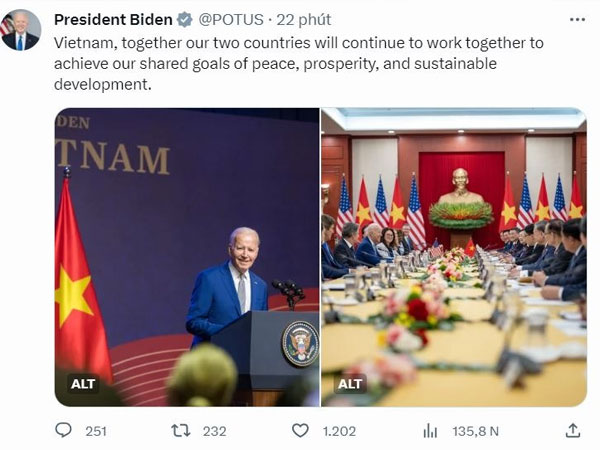 Ngay sau đó, trên một bài đăng khác trên mạng xã hội X, Tổng thống Biden đăng ảnh ông và Tổng Bí thư Nguyễn Phú Trọng kèm chú thích: "Thật tuyệt vời khi được trò chuyện với ngài Tổng Bí thư".