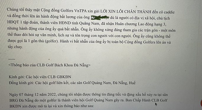 "Chúng tôi thay mặt Cộng đồng Golfers VnTPA xin gửi lời xin lỗi chân thành đến cô caddie và đồng thời lên án hành động của ông D.