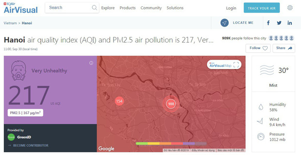 Từ 6h sáng 30/9, theo Air Visual, chỉ số chất lượng không khí tại Hà Nội lên tới 265, chỉ số bụi mịn PM2.5 là 215,4 µg/m3, cao gấp 8 lần quy chuẩn quốc gia (25 µg/m3) và 20 lần trung bình năm của Tổ chức Y tế Thế giới (WHO).