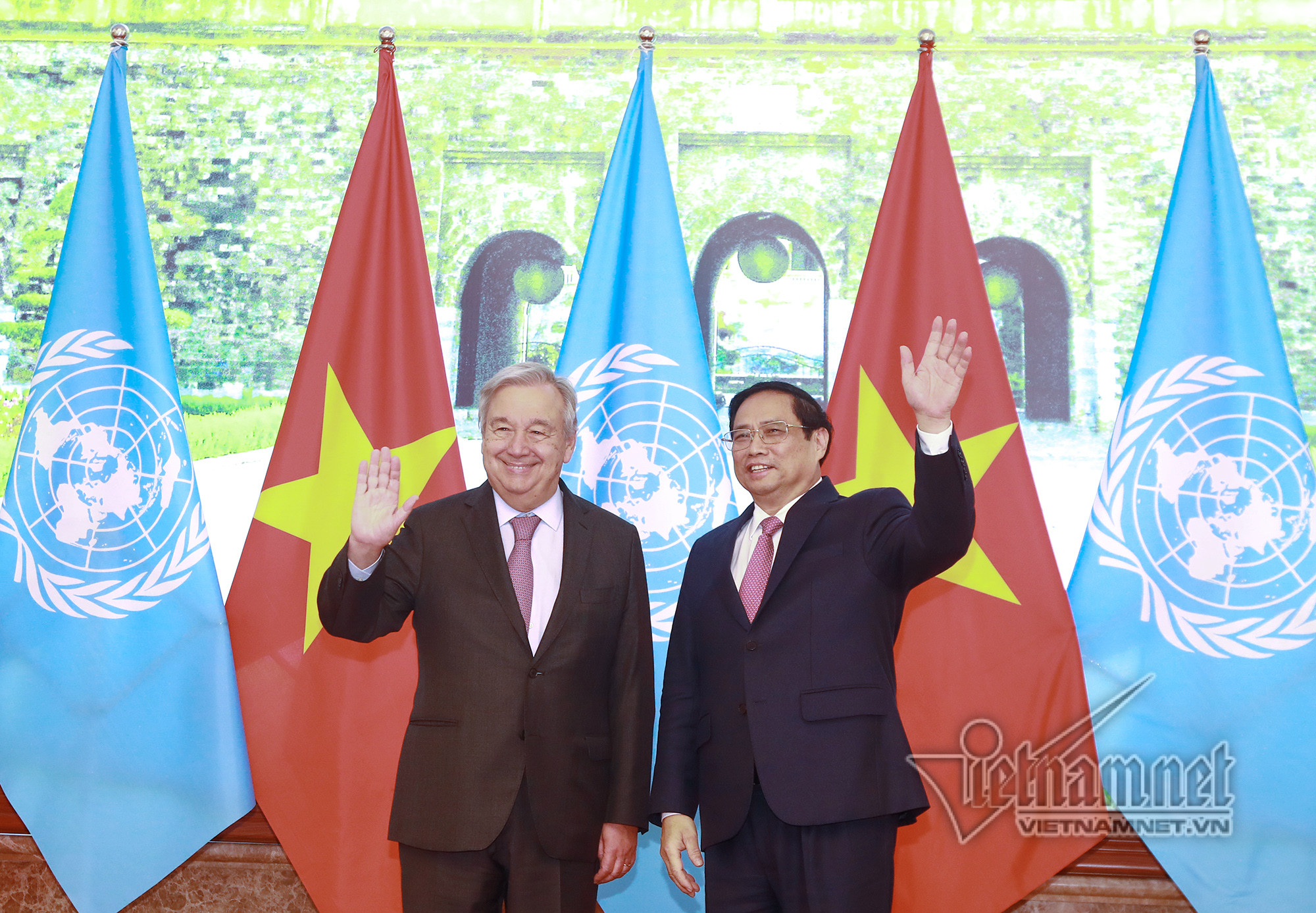 Tổng Thư ký António Guterres khẳng định LHQ và cá nhân ông sẽ tiếp tục quan tâm, hỗ trợ các ưu tiên phát triển của Việt Nam; hỗ trợ Việt Nam về tư vấn chính sách phục hồi sau đại dịch theo hướng xanh, bền vững và tự cường, đồng thời cam kết sẽ tiếp tục thúc đẩy quan hệ Việt Nam – LHQ phát triển toàn diện, hiệu quả.