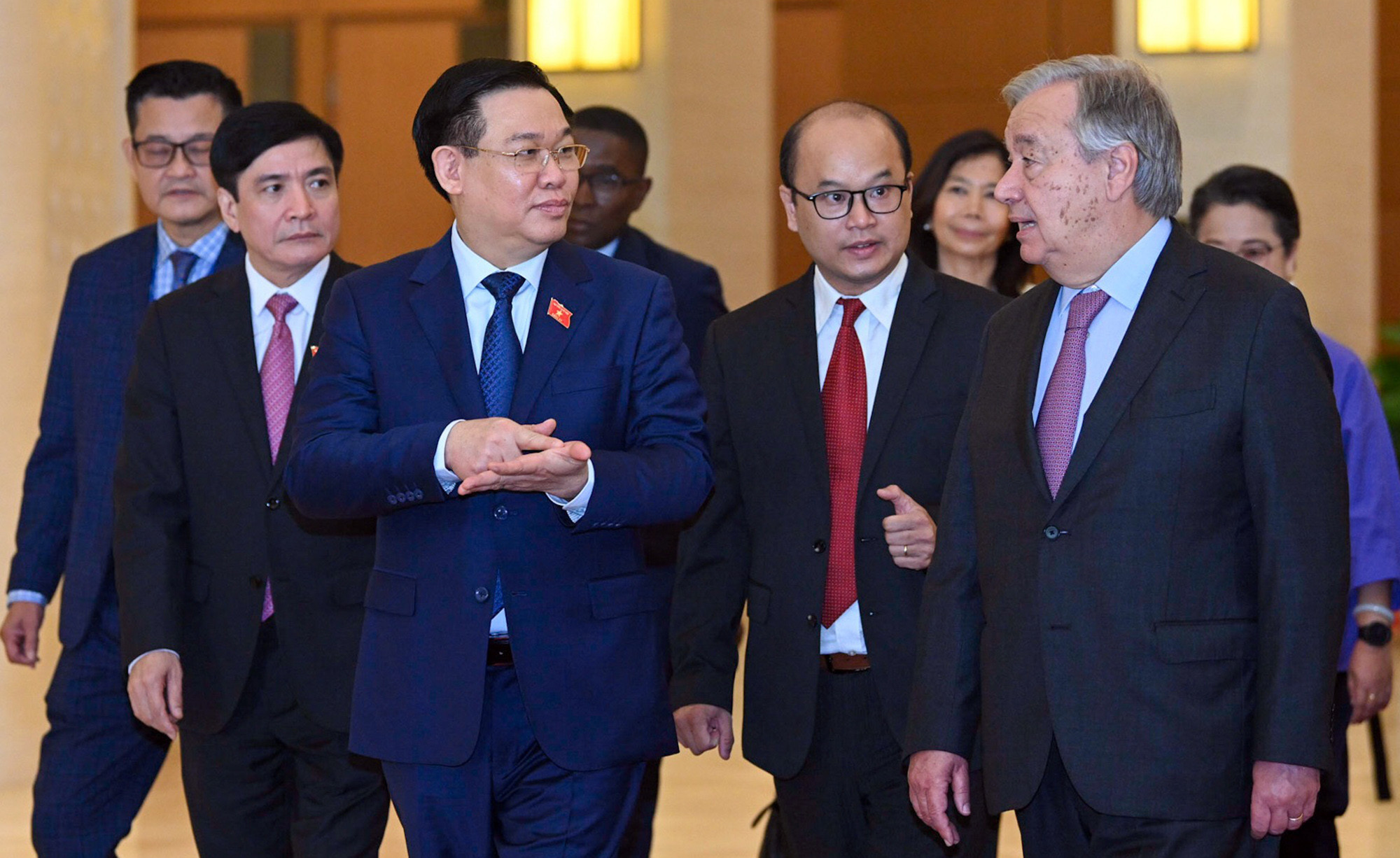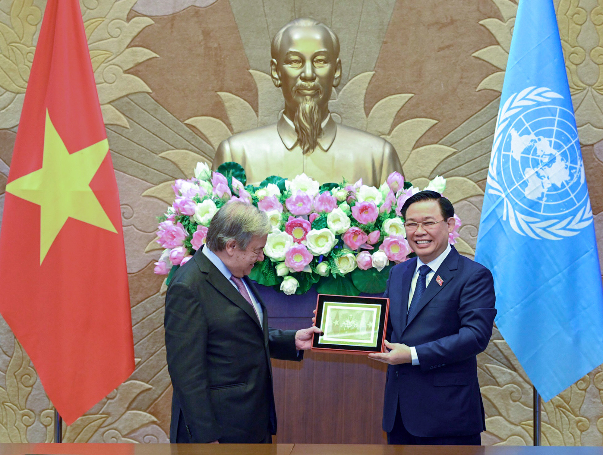 Tổng Thư ký LHQ Antonio Guterres bày tỏ vui mừng sang thăm Việt Nam và Nhà Quốc hội Việt Nam; chia sẻ, Việt Nam là đất nước ông đã luôn dõi theo và hết sức khâm phục từ những năm tháng đấu tranh giải phóng dân tộc, thống nhất đất nước cho đến giai đoạn phát triển như ngày nay với những thành công rất lớn, trở thành tấm gương trong cộng đồng quốc tế về xóa đói giảm nghèo, phát triển và hội nhập quốc tế.