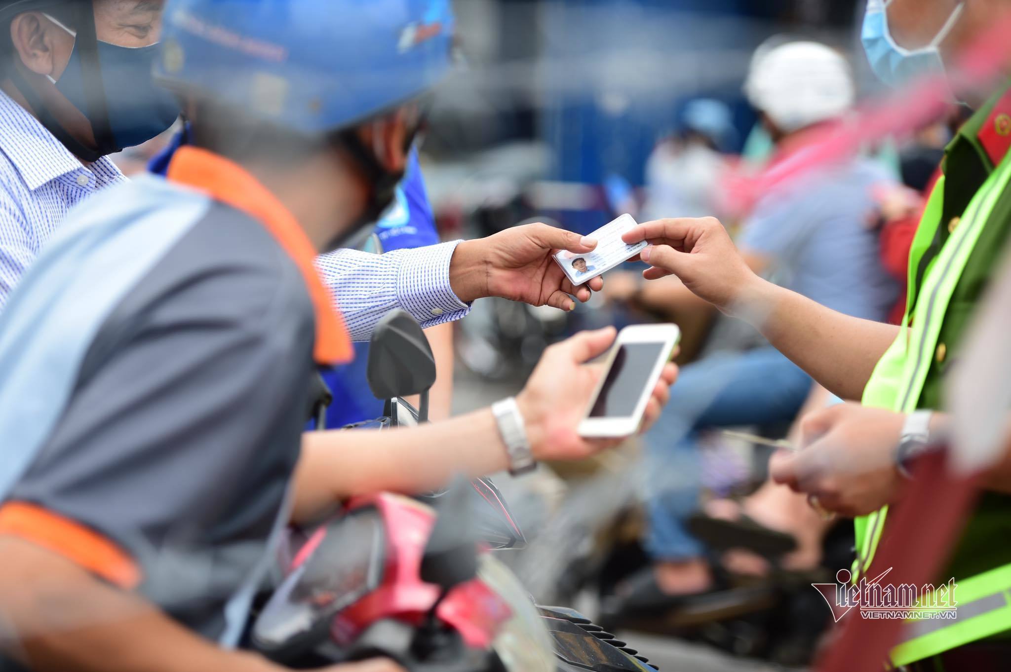 Chính quyền thành phố yêu cầu mọi người dân ở nhà. Trong hình là người dân xếp hàng tại chốt kiểm soát quận Gò Vấp những ngày đầu áp dụng Chỉ thị 16. Ảnh: Trương Thanh Tùng