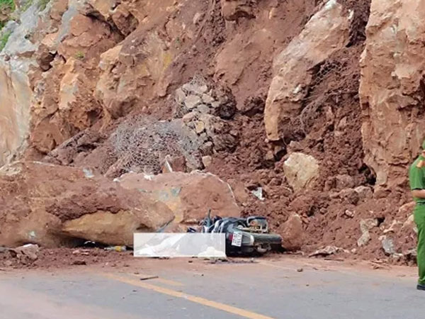 Khi đến Km 300+800 đường tránh QL6 (thuộc địa phận bản Hịa, xã Hua La, TP Sơn La), xe máy tự đâm vào đống đá sạt lở từ taluy dương xuống lòng đường.