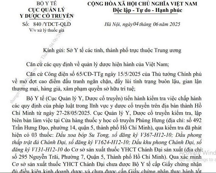 Cục Cục Quản lý Y, Dược cổ truyền đề nghị Sở Y tế các tỉnh, thành thông báo cho các cơ sở kinh doanh, sử dụng thuốc về 3 thuốc nêu trên; phối hợp với các cơ quan chức năng liên quan kiểm tra các cơ sở kinh doanh thuốc trên địa bàn, xác minh thông tin và truy tìm nguồn gốc về sản phẩm thuốc giả nêu trên, xử lý các tổ chức, cá nhân vi phạm theo quy định hiện hành.