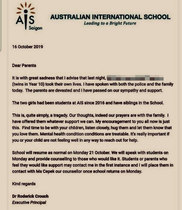Ngày 16/10, ông Roderick Crouch, Hiệu trưởng điều hành trường Quốc tế Australia (AIS) ở TPHCM đã có thông báo đến các phụ huynh về sự việc 2 học sinh là chị em sinh đôi quốc tịch Malaysia, đang theo học lớp 10 tại trường đã tự tử ở nhà riêng. Các em đã học ở trường từ năm 2016.