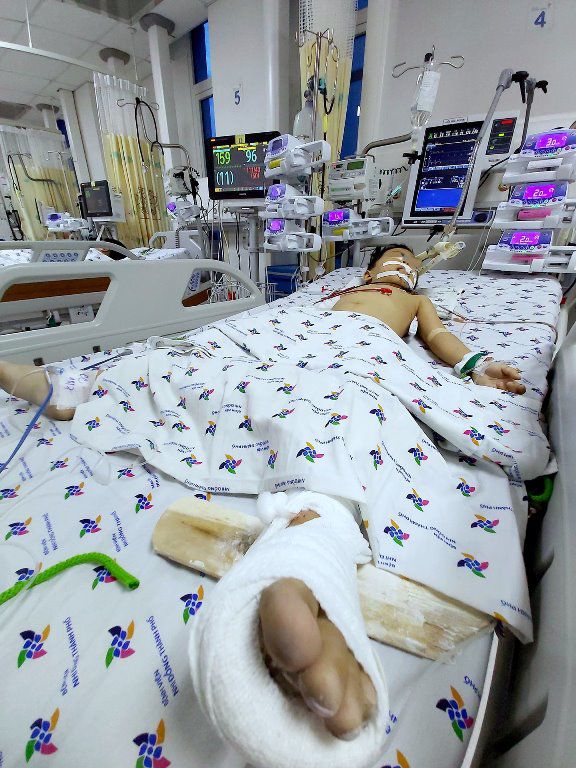 “Rất may mắn, kết quả kiểm tra sơ khởi không cho thấy có chấn thương và xuất huyết ở não, bệnh nhi có chấn thương dập gan, dập phổi, tràn khí, tràn máu phổi phải, xuất huyết nội lượng ít, gãy thân xương cánh tay phải, gãy cổ và thân xương đùi 2 bên.