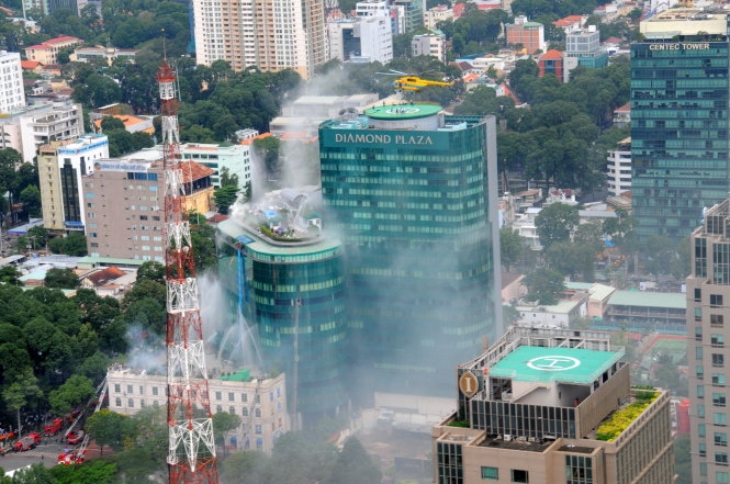 | Một trực thăng treo trên nóc tòa nhà Diamond Plaza trong một cuộc diễn tập PCCC - Ảnh: MY LĂNG |