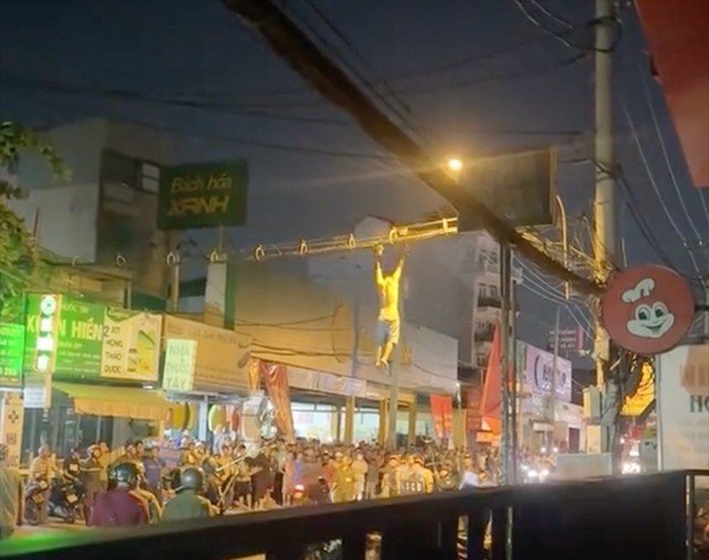 Khi lực lượng chức năng triển khai phương án tiếp cận, nam thanh niên tiếp tục có hành vi nguy hiểm khi leo lên hệ thống dây cáp viễn thông bắc ngang qua đường nhằm trốn tránh sự truy bắt.
