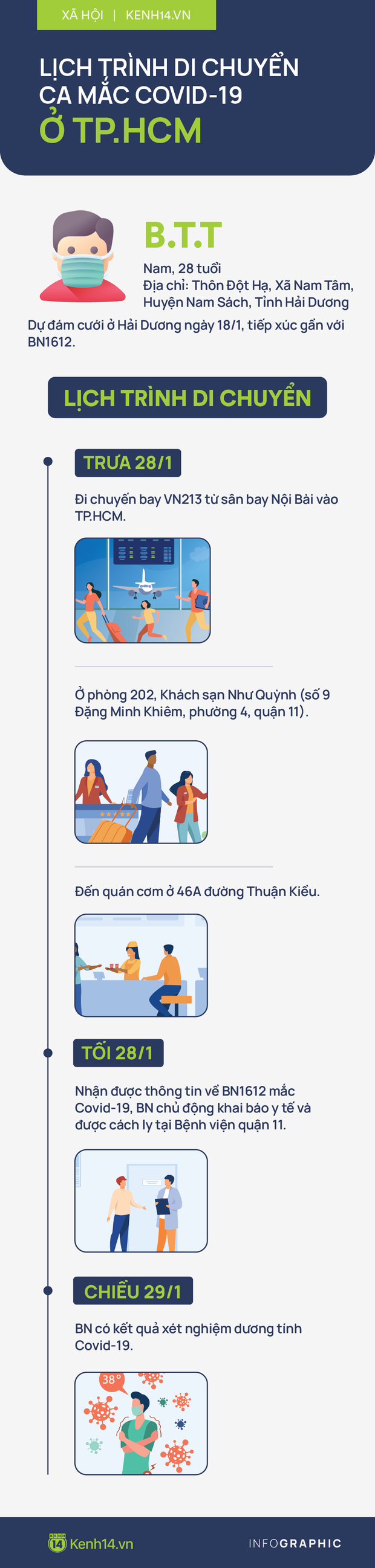 Theo đó, bệnh nhân đi trên chuyến bay VN213 từ Hà Nội, ngồi ở ghế 31A đến sân bay Tân Sơn Nhất lúc 15h ngày 28/1. Bệnh nhân thuê phòng tại khách sạn trên đường Đặng Minh Khiêm, phường 4, quận 11. Bệnh nhân có đi mua cơm tại quán cơm ở 46A đường Thuận Kiều, rút tiền tại trụ ATM đối diện quán cơm. Tối cùng ngày, bệnh nhân được người nhà thông báo là tiếp xúc gần của bệnh nhân 1612, nên đã chủ động khai báo y tế và được cách ly ngay sau đó.