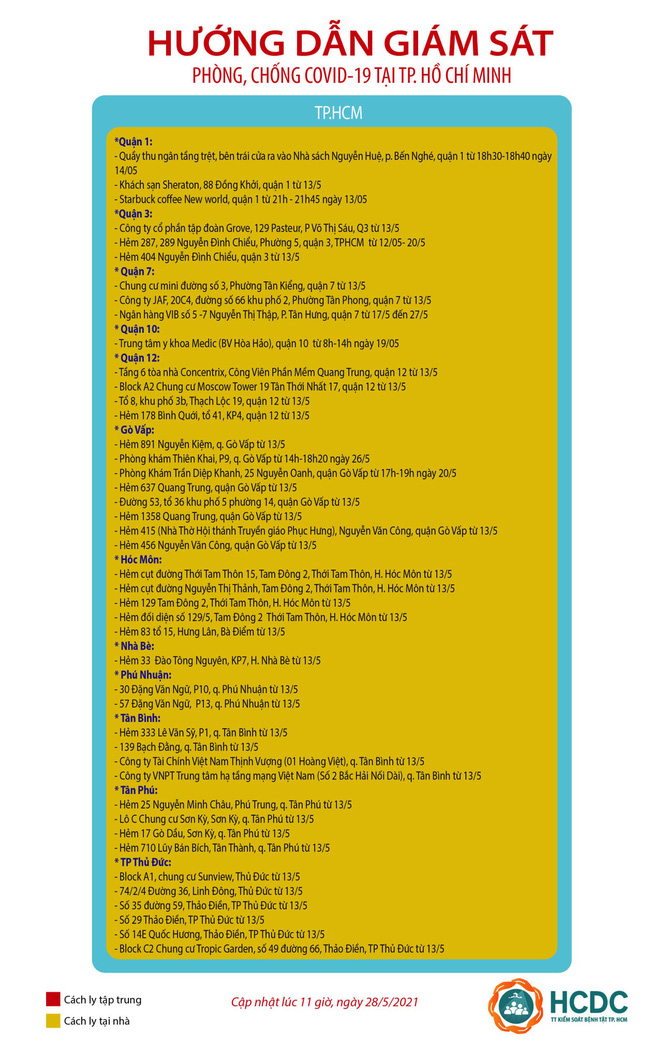 HCDC đề nghị người từng đến và liên quan đến các địa điểm sau đây trong mốc thời gian ghi nhận có ca nhiễm, nghi nhiễm COVID-19 cần cách ly tại nhà.