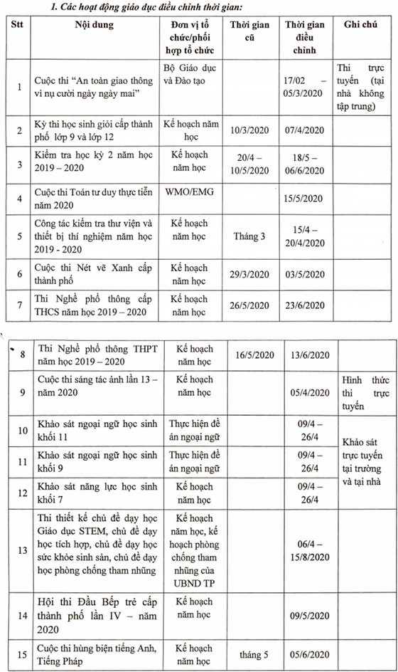 Do ảnh hưởng của việc học sinh nghỉ dịch virus corona, Sở điều chỉnh mốc thời gian các hội thi và hoạt động giáo dục cấp thành phố trong học kỳ 2 năm học 2019-2020.