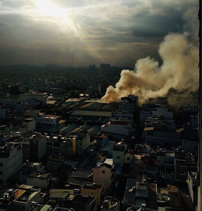 Cột khói bốc cao, bao trùm khu vực phường Hiệp Tân khiến nhiều người sinh sống tại đây lo lắng.