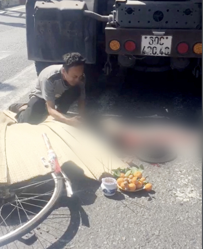 Xe container ôm cua cán tử vong cụ bà đi xe đạp. Con trai ra hiện trường ôm thi thể mẹ khóc nghẹn gọi “Mẹ ơi” trong đau đớn.