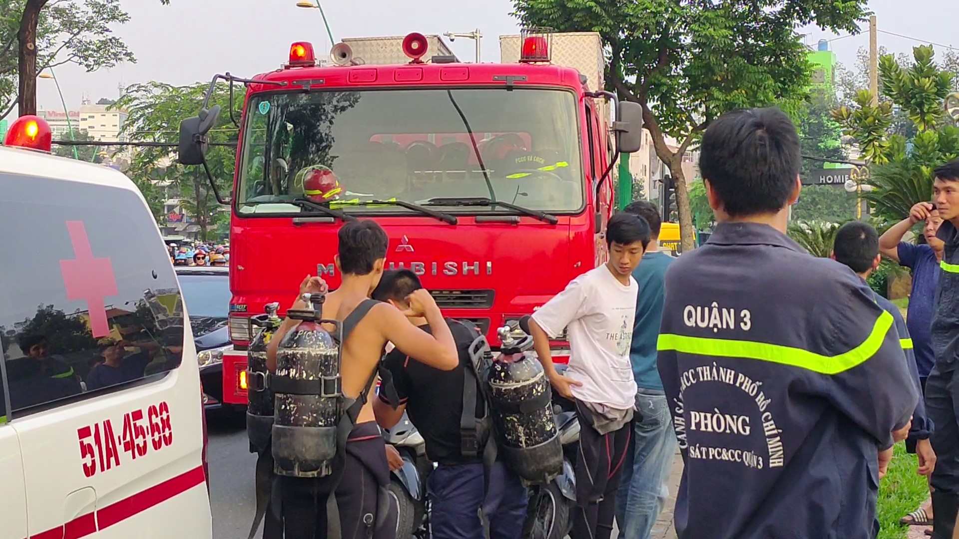 Thời điểm trên, hàng trăm người dân lưu thông qua cầu dừng lại theo dõi sự việc khiến một đoạn đường Hoàng Sa, phường 9, quận 3 bị tắc nghẽn.