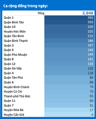 Cụ thể, quận 1 phát sinh 290 ca dương tính, trong đó 265 ca phát sinh ngoài cộng đồng và trong bệnh viện.